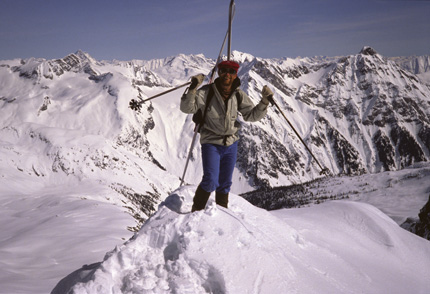The face looks like an inside out wedding cake with each level bordered by steep snow or ice cliffs. The deep snow pulls my ski off in the second turn. I break the fall with a ski pole arrest, but gravity and the weight of cascading snow keep me going. I shove the pole in all the way up to the handle and finally stop. Anchored off the wrist loop I reach out to my dangling foot and reattach the ski. Further down the mountain we dodge crevasses and drop-offs. The Ruedi mantra repeats in my head. [right: Pies on Mt. Durrand summit, Ruedi Beglinger photo]