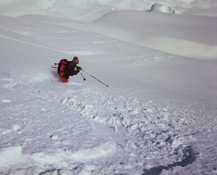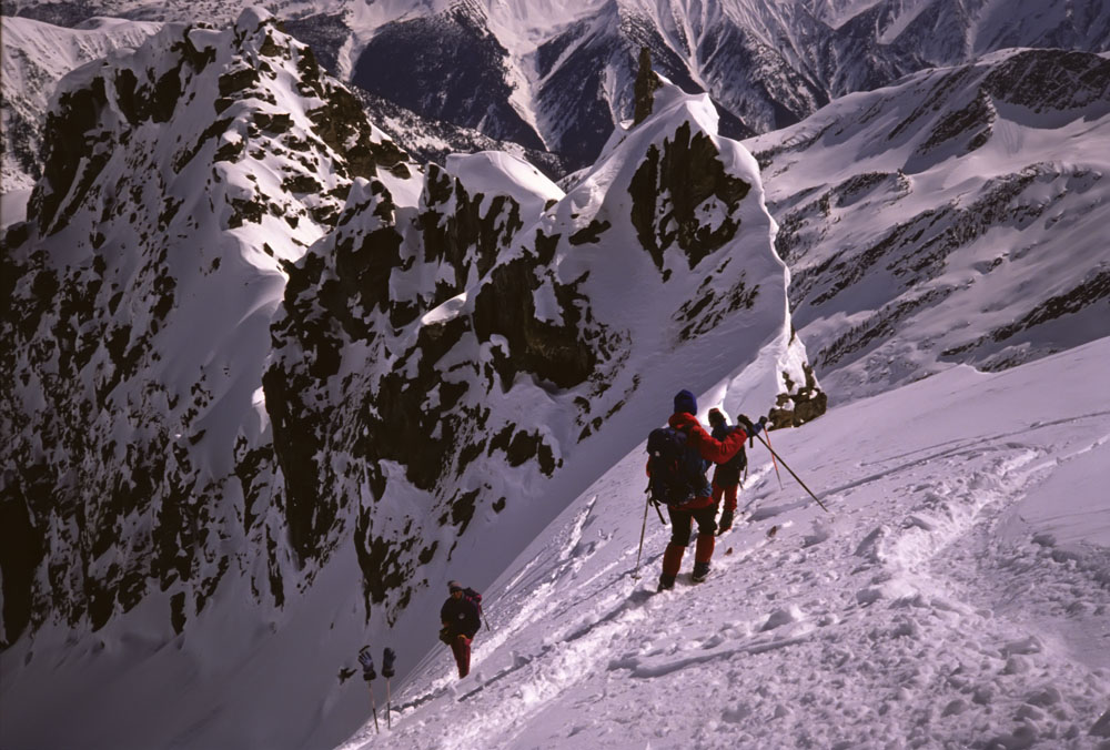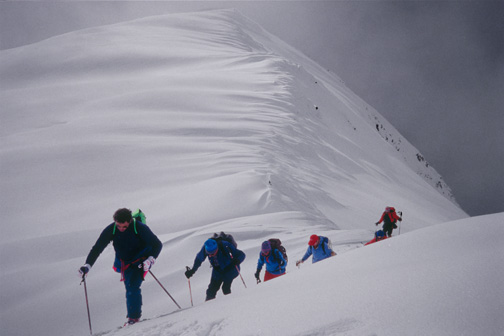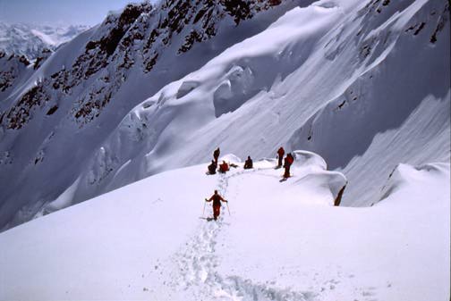 Ruedi flatters and frightens us by making our final ski day one of awe. We will ski the north face of Mt. Durrand, a descent which he's only led two groups down in his years of guiding. The approach up a south facing chute is so steep that it seems odd not to be hearing the clunk of ice axes-instead S.M.E. guides have set a perfect line of steps making the ascent an easy climb up a snow ladder. An airy traverse along a near knife edge ridge on top puts us above 1900 vertical feet of the most spectacular skiing our stomachs care to imagine.
