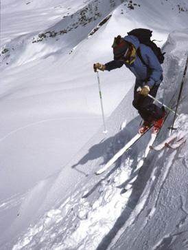 The next two days are spent in ski heaven. Photographers make wall posters on days like these. There haven't been four hours of accumulated sunshine in the past five days and now we are soaked with all the rays we can stand. Snow conditions have improved so much that my legs are finally using less energy to ski down the mountain than to climb up it. Each turn detonates a snow explosion as adrenaline fuels the body in a dance of euphoria. Too much red lining the fun meter has its price, blowing out my legs and sending me for one of those face plants when you think snow will squirt out your ears. Powder run after powder run and does Ruedi give us a break? Not a chance, today he pushes us up 6000 vertical feet. [left: Ross Hodgetts drops off Allalin Peak]